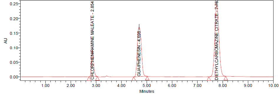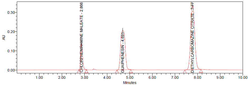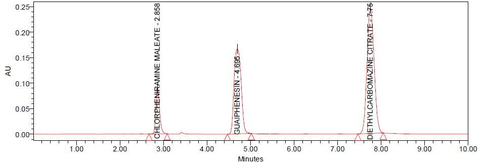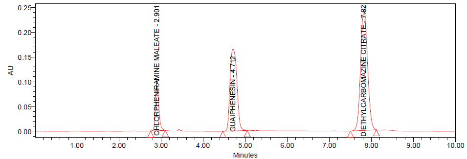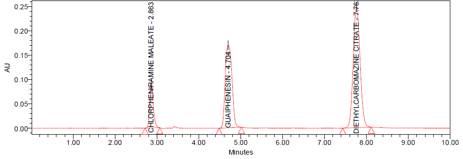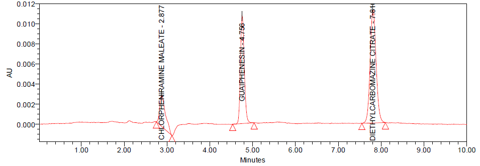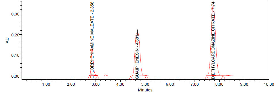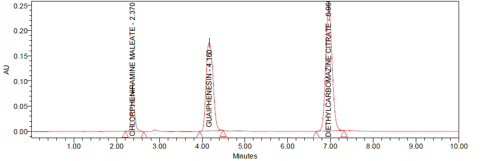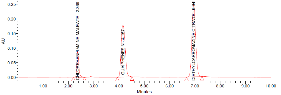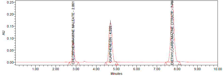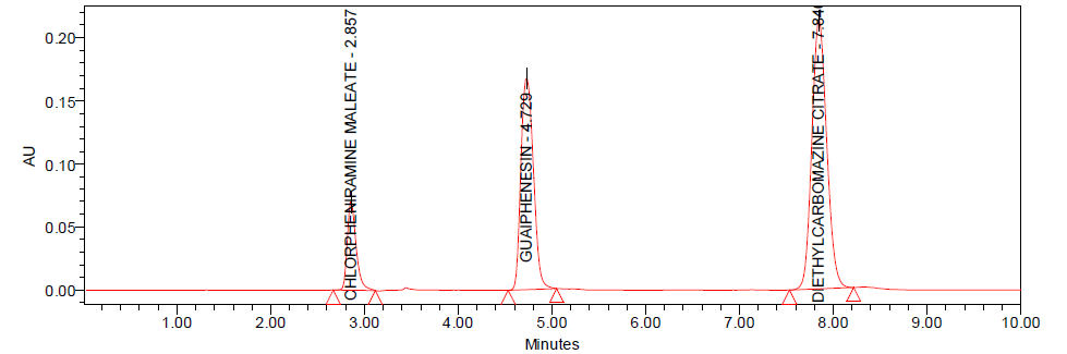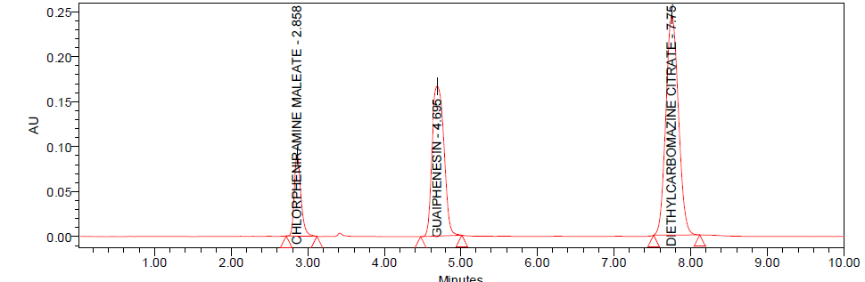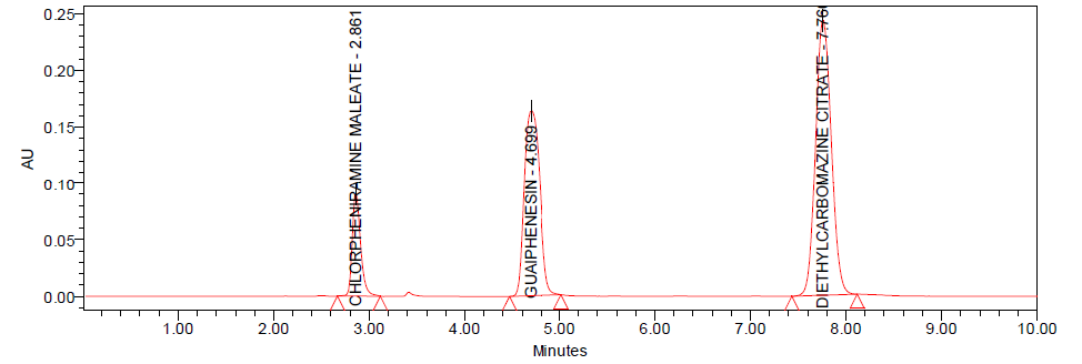 10 µl of working standard solution (10µg/ml of diethylcarbamazine citrate, 6µg/ml of guaiphenesin and 0.2µg/ml of chlorpheniramine maleate) was prepared and injected into the system. It was determined by making six replicate injections and all the parameters were found to be within the limits. The results are given table 1.