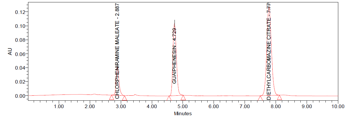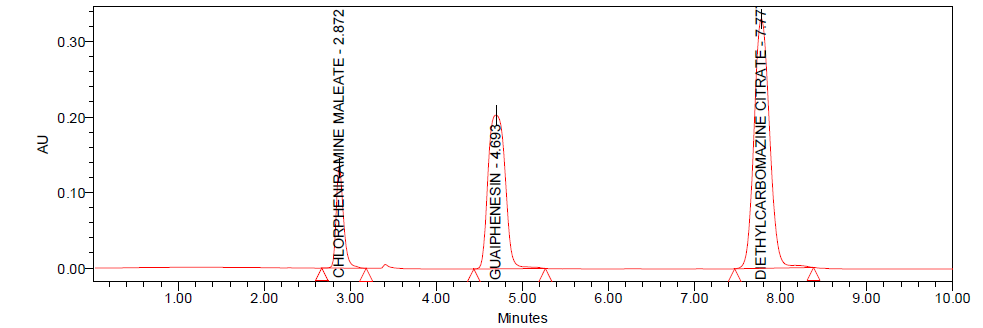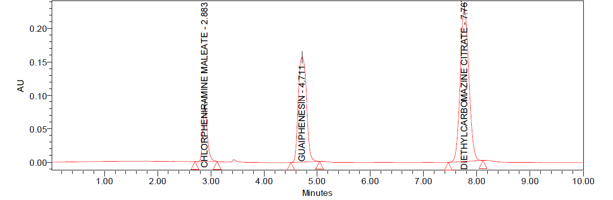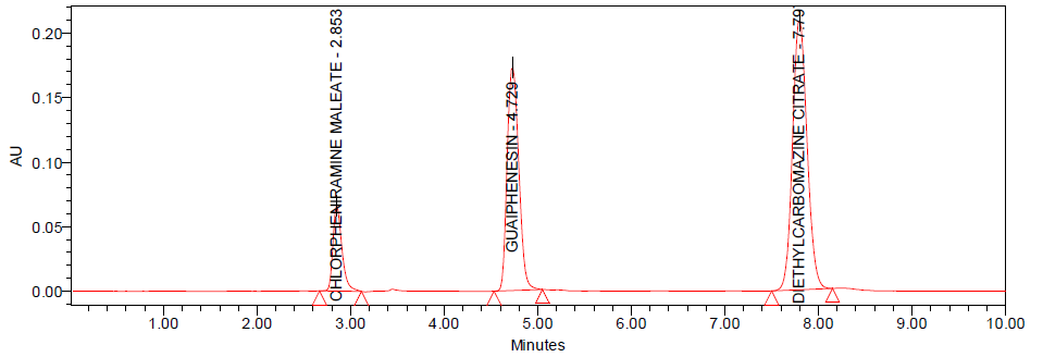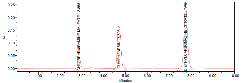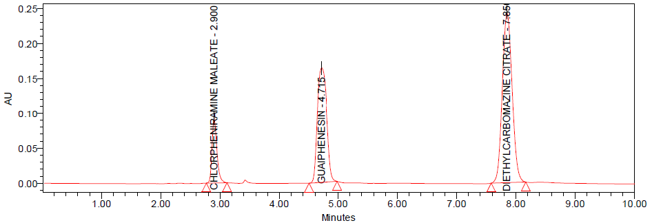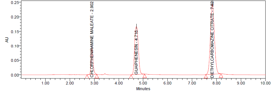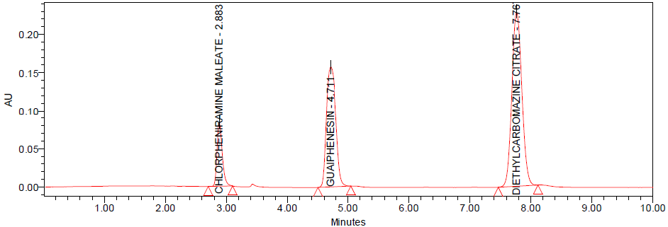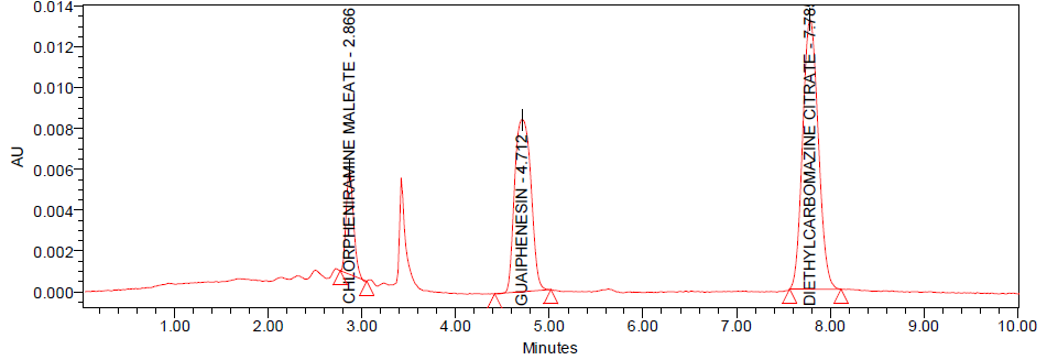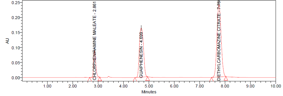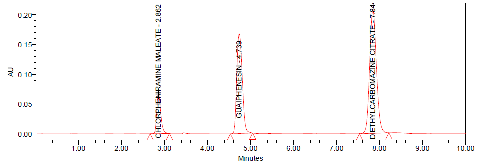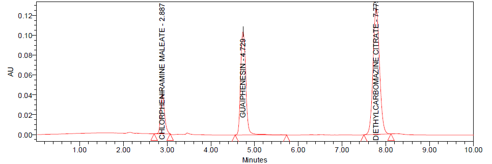 10 µl of working standard solution (10µg/ml of diethylcarbamazine citrate, 6µg/ml of guaiphenesin and 0.2µg/ml of chlorpheniramine maleate) was prepared and injected into the system. It was determined by making six replicate injections and all the parameters were found to be within the limits. The results are given table 1.