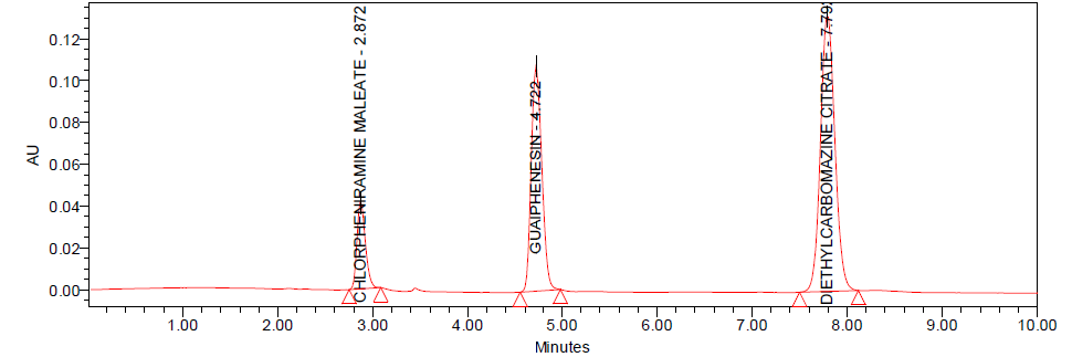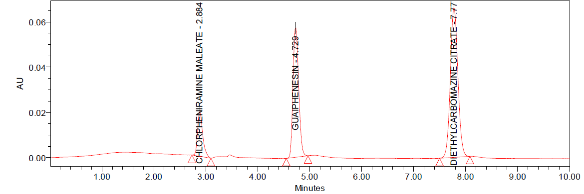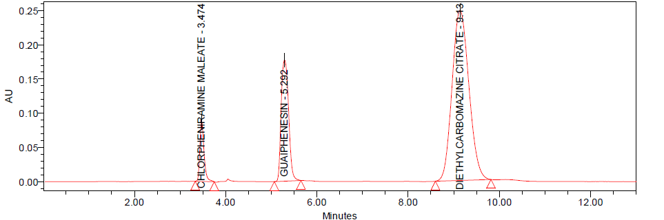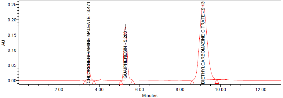 Fig. 5: Typical chromatogram for diethylcarbamazine citrate, guaiphenesin and chlorpheniramine maleate
