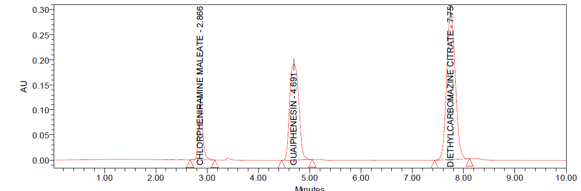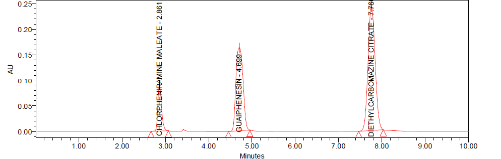 100 mg of diethylcarbamazine citrate, 60 mg of guaiphenesin, 2 mg of Chlorpheniramine maleate (working standard) were weighed accurately and transferred into a 100 ml volumetric flask.70 ml of mobile phase was added to the above flask and then sonicated about 20 min for uniform mixing and then diluted 1 ml of the above solution to 10 ml with the mobile phase and again 1 ml of the solution was diluted to 10 ml with same mobile phase.