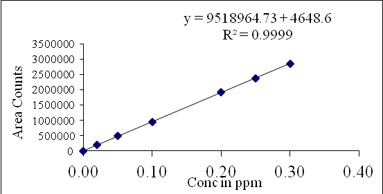 Six series of standard solutions were selected for assessing linearity range. By using peak area versus concentration of the standard solution calibration curve was plotted and the regression equations were also calculated. The slope, intercept and the correlation coefficient was calculated by least squares method.