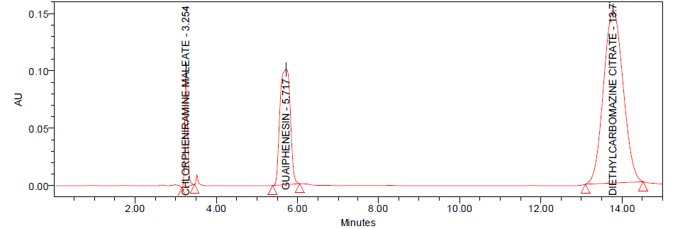 Results: The retention time of chlorpheniramine maleate, guaiphenesin and diethylcarbamazine citrate were 2.86, 4.89 and 7.76 min respectively. Validation of the proposed method was carried out according to an international conference on harmonization (ICH) guidelines. The established method was linear in the range of 1-15, 0.6-9, 0.02-0.3 µg/ml and correlation coefficient was 0.999, 0.9991, and 0.993 for diethylcarbamazine citrate, guaiphenesin and chlorpheniramine maleate respectively.