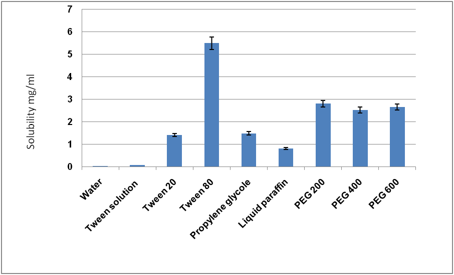 Solubility studies of lacidipine were carried out in water, tween solution, propylene glycol, PEG 200, PEG 400, PEG 600, tween 80, tween 20 and liquid paraffin. Saturated solutions were prepared by adding an excess drug to the vehicles and shaking in a water bath with a shaker for 48h at 25±0.5 °C under constant vibration. After this period the solutions were filtered, diluted and analyzed by spectrophotometer at λmax 282 nm (cary, Australia). Three determinations were carried out for each sample to calculate the solubility of lacidipine.