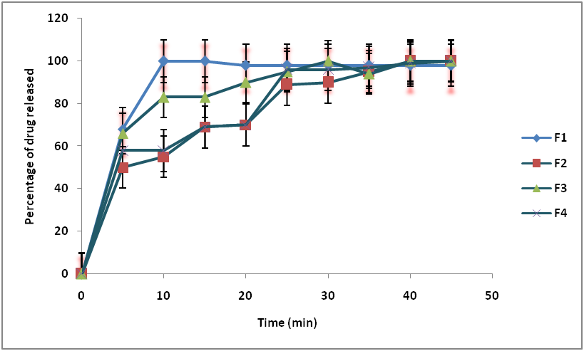 The dissolution rates of all formulations were measured by using tablet dissolution apparatus USP Type II. Dissolution studies were carried out using 500 ml of purified water with 1% w/v polysorbate 20, at 50 rpm and at temperature of 37±0.5 C˚. 10 ml aliquots were withdrawn at suitable time interval (5, 10, 15, 20, 25, 30, 35, 40 and 45 min), filtered through syringe filter 0.45µm and diluted as per need and replaced with fresh medium.