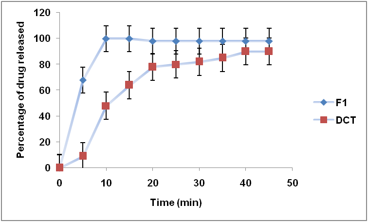 The results in the table clearly affirm that the liquisolid tablet F1 had the highest percentage 100 % of lacidipine dissolved in 10 min, while 48% of the drug was released from DCT. All liquisolid tablets show completely 100% of drug release at 45 min. However, DCT show less drug release at this time.