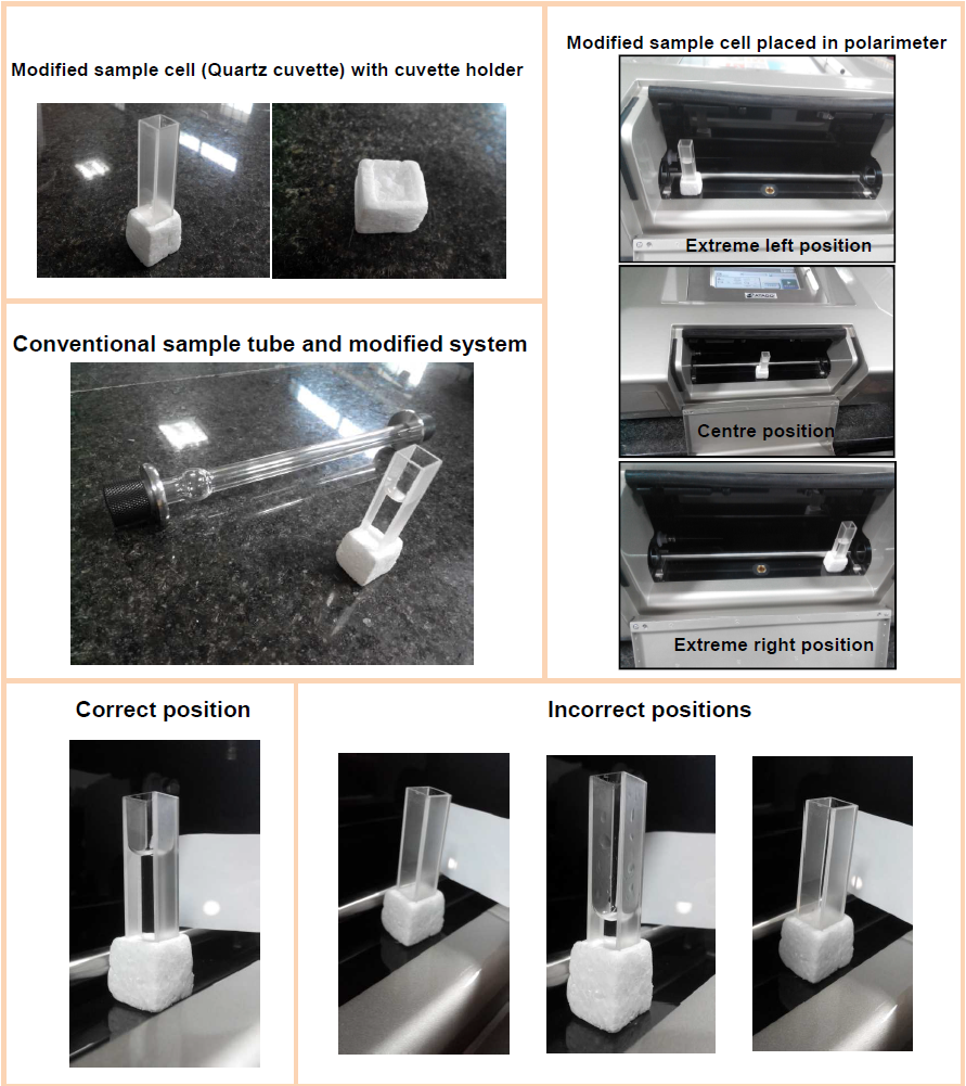 Fig. 1 displays the photographs describing the modified polarimetric assay method for small volume samples. Our method employed quartz cuvette (used for UV-Vis spectrophotometry) instead of conventional polarimetry tube. Conventional polarimetry tubes have several disadvantages such as high cost, therequirement of large sample volume and need of bubble trap. In this scenario, quartz cuvettes are advantages in terms of low cost (in comparison to conventional polarimetry tube) and requirement of small sample volumes (around 1 ml is sufficient). Moreover, there is no need for bubble trap in the case of quartz cuvette. Quartz does not absorb at 589 nm (the sodium D line) employed in the study and therefore is well suited for this purpose. A fixed path length of 1 cm is an added advantage of quartz cuvette.