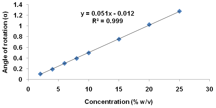 The calibration curve was plotted using the concentration range of 2-25 %w/v. The angle of rotation of the solutions was determined at a wavelength of 589 nm and 25 °C. A calibration curve was constructed by plotting angle of rotation versus concentration of thestandard solution and the regression equation was determined. The experiment was carried out in triplicate.