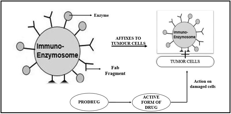 The potency of traditional anticancer drugs for the treatment of chemotherapy is confined due to theinadequacy of discrimination between normal as well as cancerous cells. On reviewing the studies on immuno-enzymosomes could be used to target enzymes to for achieving site peculiar activation of anticancer prodrugs. The potency of generating a sole well portrayed liposomal system which is having a binding capacity to variety targeted ligands is significant worth. These methods offer the hiding of enzyme within small packet like structures and releasing them on reaching action site [64]. It was stated that enzyme, β-glucuronidase, which was proficient in stimulating anthracyclineglucuronideprodrugs, when coupled with immunoliposomes surface aimed against ovarian cancer cells (OVCAR-3). Thus, by cleansing commercially accessible enzyme β-glucuronidase (GUS) an immune-enzymosome formulation could be prepared which had a 2 times increase in its enzyme specific activity when incubated with ovarian cancer cells[65]. The principle involves fusion of a cell unique antibody with (liposome) immunoliposome enclosing the chemotherapeutic agent, thus providing aprobability for selective drug transmission and cell-specific cytotoxicity as seen in fig.3 [66]. This results in new derivatives of therapeutic proteins having minimum immune-genicity. The antibody-enzyme complex was administered, pursued by injection of comparable non-toxic prodrug after binding of the complex with cancerous cells and cleared from the blood and tissues. Targeted by the enzyme’s action, the prodrug is converted to active cytotoxic molecule within the concurrence of tumour cells, therefore leading to its selective wiping out.