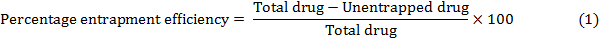 Entrapment efficiency of the valacyclovir loaded niosomes was determined by centrifugation method using a centrifuge with 10000 rpm maintained at 4 °C for 10 min. The supernatant is filtered by using Whatman filter paper to get a clear fraction. From the filtrate, the unentrapped valacyclovir was determined by UV-Visible spectrophotometer (Shimadzu, Japan) at 235 nm [21]. Each experiment was carried out in triplicate. The entrapment efficiency was calculated from the formula given in the equation 1.