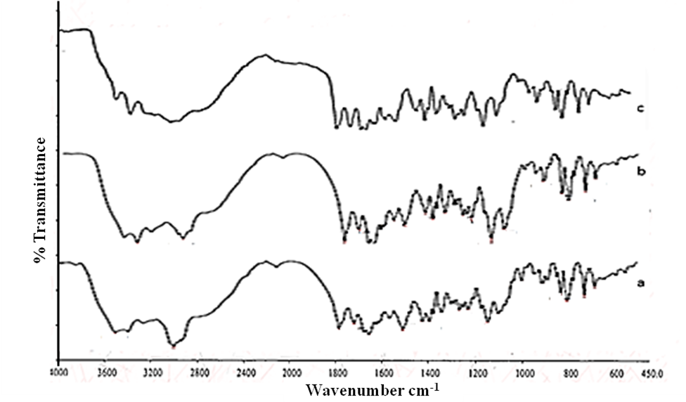Fig. 1: Fourier transform infrared spectra of (a) valacyclovir, (b) valacyclovir+cholesterol, (c) valacyclovir+span 60