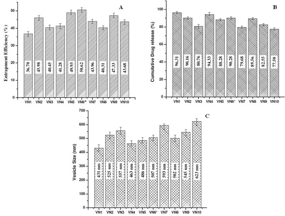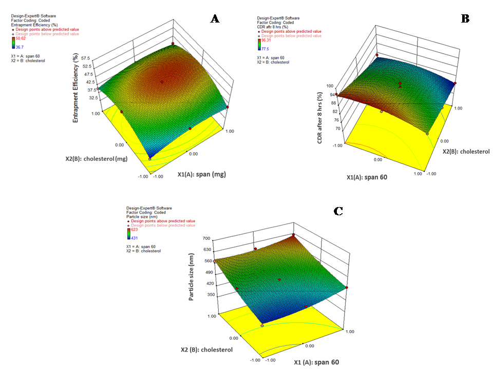 The inference from model analysis suggests that the increase in the concentration of cholesterol decreases the entrapment efficiency and increases the vesicle size, whereas an increase in span 60 decreases the cumulative drug release.