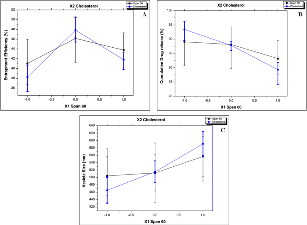 Fig. 3: Interaction plot showing the effect of X1 and X2 on (A) entrapment efficiency Y1 (%), (B) cumulative drug release Y2 (%), (C) vesicle size Y3 (nm), the values are given as mean±SEM, where n=3