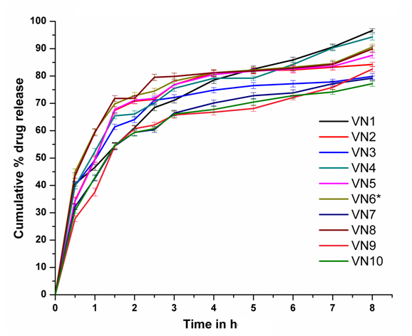 The cumulative in vitro drug release was performed in phosphate buffer pH 7.4 by dialysis method. It was observed that the drug release of all the formulations ranged from 77.5 % to 96.31 % at 8th hour (fig. 2 B) with an initial burst release at 0.5 hour (fig. 4), this may be due to the release of the surface drug. The increase in the concentration of span 60 and cholesterol decreases the drug release of the formulated niosomes (fig. 3 B). This might be due to the fact that increased surfactant acts as a depot, whereas the increase in cholesterol hardens the vesicle and thereby reducing the leakage of the drug into the medium [28].
