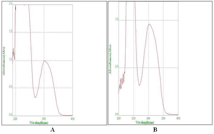 10 mg of bromocriptine mesylate was dissolved in100 ml of 0.1 N HCl (pH 1.2) and phosphate buffers (pH 6.8) with (0.5% w/v Brij-35) individually to make a stock solution of concentration (0.1 mg/ml). Then From this prepared stock solution, a diluted solution (0.065 mg/ml) was established and determined the λmax of bromocriptine mesylate using UV spectrophotometric analysis at 200-400 nm.