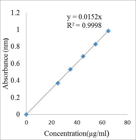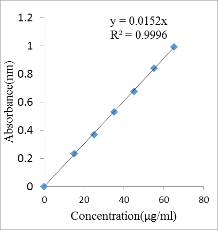 Calibration curves for bromocriptine mesylate in 0.1 N HCl and phosphate buffers (pH 6.8) with (0.5% w/v Brij-35) were made by preparing consecutive dilutions of the drug from a stock solution (0.1 mg/ml), samples (65, 55, 45, 35, 25 and 15 µg/ml) were then analyzed by spectrophotometric method for bromocriptine mesylate at its λ max (305 nm) [7].