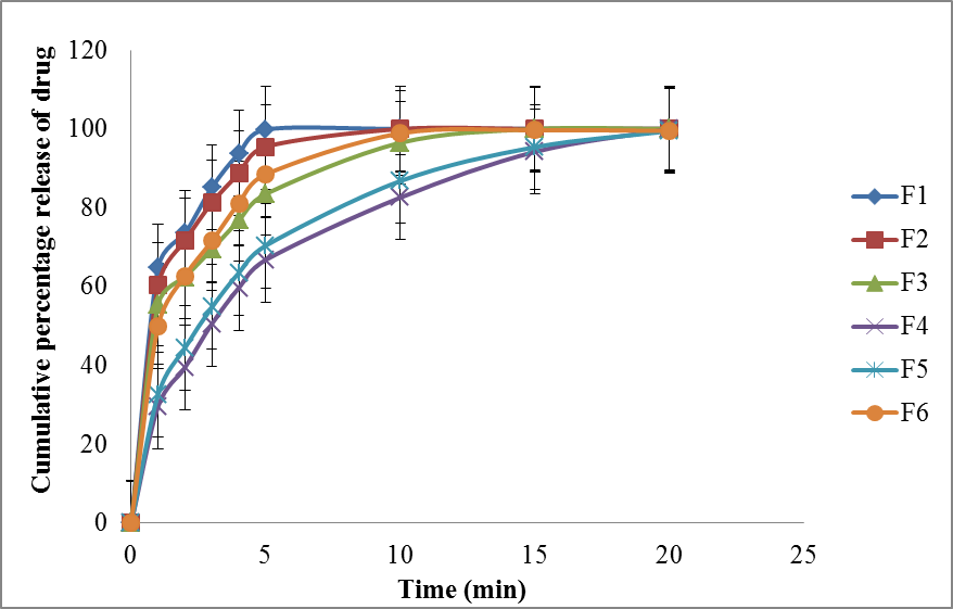 The dissolution study was carried out using USP type II (paddle apparatus) with 300 ml of Phosphate buffer pH 6.8 with (0.5% w/v Brij-35) as a dissolution medium maintained at 37±0.5 °C. The medium was stirred at 50 rpm for 30 min. Samples were withdrawn by using a syringe at regular intervals (1, 2, 3, 4, 5, 10, 15 and 20 min) replaced with fresh medium in order to maintain sink conditions; before analyzing the withdrawn samples using UV-spectrophotometry at λmax 305 nm they must be filtered by using filter syringe (0.45μm).