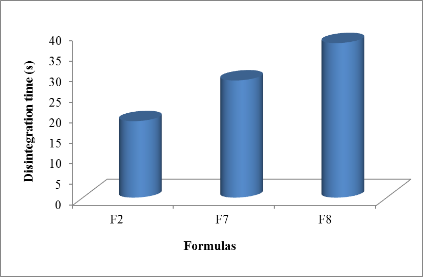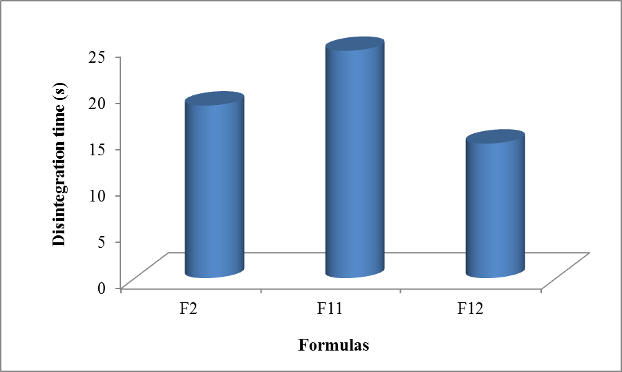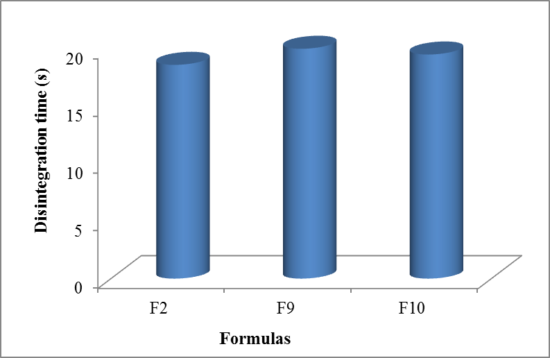 Different concentration of PEG400 (20, 15 and 25 %) which present in formulas (F2,F11 and F12) show a decrease in disintegration time as the plasticizer concentration increased as shown in fig. (9) this occurs because PEG 400 act as a co-solvents that reduce the ability of water to squeeze out non-polar, hydrophobic compounds, thus increasing solubility [40].