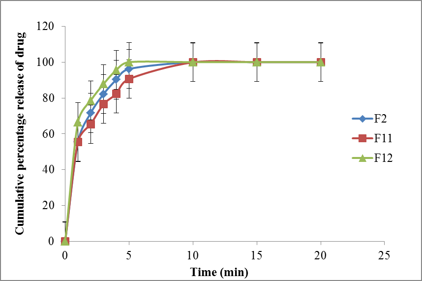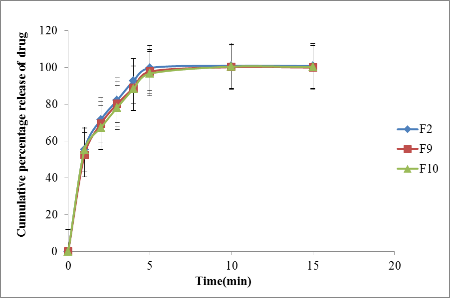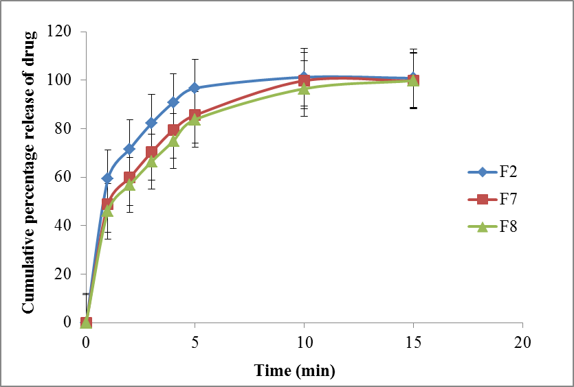 The time needed for 80% of medication to be released (T80%) and percent medication dissolved in 2 min (D2 min) from the formulated films (F2, F11and F12) are listed in the table (8).