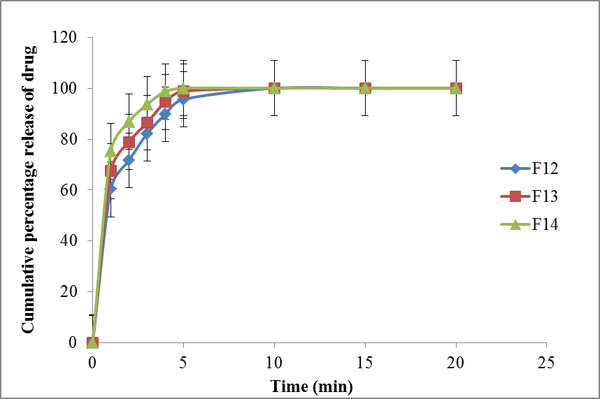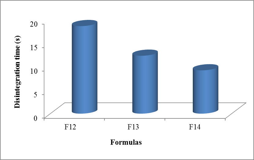 The physical properties in the table (3) showed an enhancement in the disintegration time also shown in fig. (11) with the addition of crospovidone to the prepared formula also the disintegration time was more enhanced with increasing the concentration of crospovidone from 1% to 3% w/w as shown in (F13 and F14) respectively. This disintegration enhancement is caused by the ability of crospovidone to wick saliva quickly into the film that leads to generate the volume expansion and hydrostatic pressures necessary to provide rapid disintegration in the mouth, the major mechanism of disintegration for crospovidone is wicking mechanism in addition to the swelling mechanism [43].