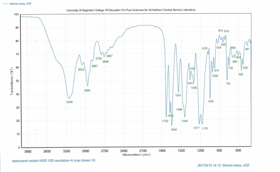 The principal peaks of the FT-IR spectrum of bromocriptine mesylate are shown in fig. (13), which is at the wave numbers(in cm-1):1047 for alcohol C-H stretching (1260-1000), 1211 for alkyl halide C-Br wagging band (1300-1150), 1361 for the S=O in sulphonate salt (1372-1335), 1444 for aromatic ring (1500-1400), 1544 for amide N-H (1650-1515), two bands 1726 and 1672 for C=O stretching in the ketone group (1870-1540), and 3261 for amide N-H stretching (3350-3180) [47].