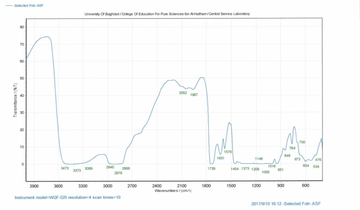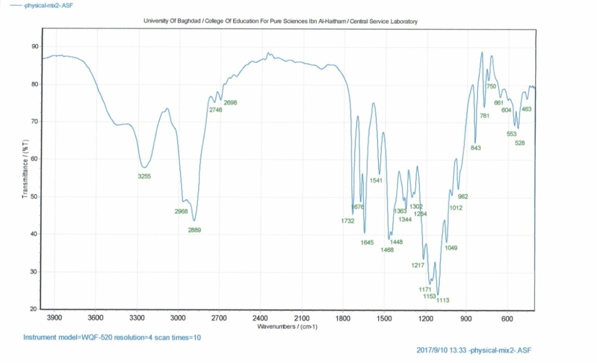 Drug-polymer interactions were studied by FT-IR spectroscopy. The spectrum was recorded for the drug, blank polymer, the physical mixture of polymer and the drug in a ratio (1:1) and the selected formula. Samples were mixed with potassium bromide and pressed in the form of a disc. The disc was analyzed by FTIR spectroscopy from 4000-400 cm-1 [23].