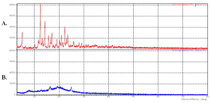 Fig. 16: A. X-Ray diffraction of pure bromocriptine mesylate, B. X-Ray diffraction of the selected formula F14