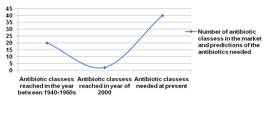 However, the world’s capacity for antibiotic discovery is already reducing the rate of emergence of bacterial resistance, and which indicates the necessity of another new class of antibiotics to be introduced in the market (Figure1). Fig. 1 showed a line drawing of total number of newer classes of antibiotics that entered to the market in the years of 1940s and 1960s, the two new classes since 2000, and further 20-40 new classes were required to support medicine in the future years from now [6].