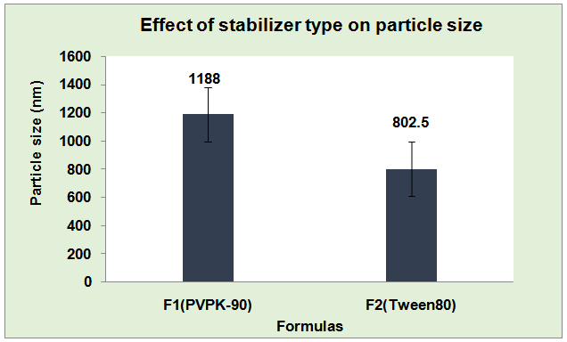 Two formulations were used to show this effect F1, F2. The best stabilizer was in F2 (tween 80) which has particle size 805.2±1.7 nm. Also, this formulation show PDI in the value of 0.489 and this low value will indicate good stability of the nanosuspension. The effect of stabilizer type shown in the fig. 2. The choice of suitable stabilizers are the most important factors to control the size and stability of the nanosuspension during nanoprecipitation methods [25]. Although; the mechanism of action of PVP K-90 which was used as hydrophilic polymers to stabilize nanosuspensions physically by steric stabilization; but they gave larger particle in ratios 1:8 drug: stabilizer in F1(p<0.05) than particle size of F2 which contain tween 80, this may be attributed to the insufficient affinity of stabilizers to drug molecule. However, if there is no affinity between the particle surface and the polymer, the attractive forces between two particles become dominant due to depletion of polymer from the gap of two particles (depletion force) [26].