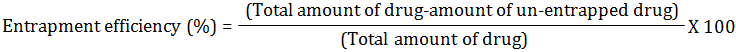 Hydrated itraconazole proniosomal dispersions were allowed to sediment using a centrifuge at 15000 rpm for 45 min. The supernatant liquid was separated, diluted to 100 ml with phosphate buffer pH 7.4, filtered using a membrane filter (0.45 µm pore size), and measured using a UV spectrophotometer [Model UV-1601PC Shimadzu, Japan] at a predetermined wavelength of 262.5 nm which was in good agreement with [Sampathi et al., 2015] [8]. The entrapment efficiency of itraconazole was calculated as follows: