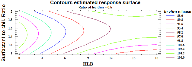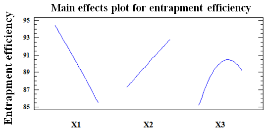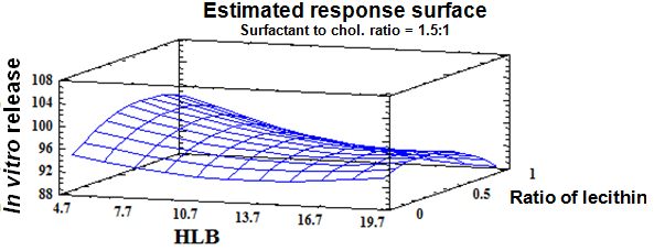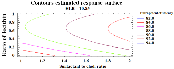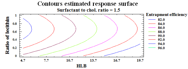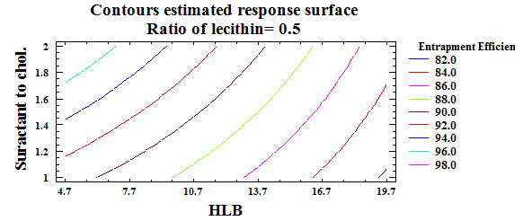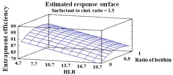 The equation represents the effect of process variables (X1, X2 and X3) on the responses (Y1, Y2, Y3 and Y4). Here, variables X2, X3 and X1X3 have positive effects on entrapment efficiency as revealed by the positive value of coefficients in the equation, it means that as the ratio of surfactant to cholesterol (X2) and a ratio of lecithin (X3) increases, entrapment efficiency increases. Whereas X1, (X1)2, X1X2, (X2)2, X2X3 and (X3)2 have negative effects on entrapment efficiency as revealed by negative values of the coefficient in equation 1, it means that as HLB (X1) increases, entrapment efficiency decreases.