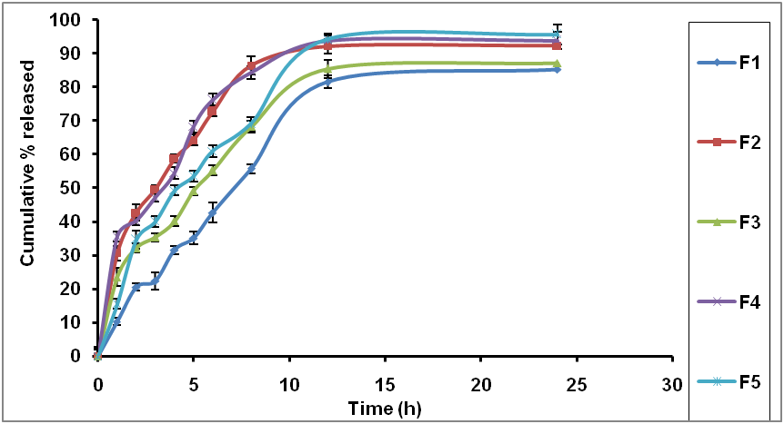 Fig. 3: In vitro release of itraconazoleniosome (F1-F5), data’s are expressed as mean±SD (n=3)