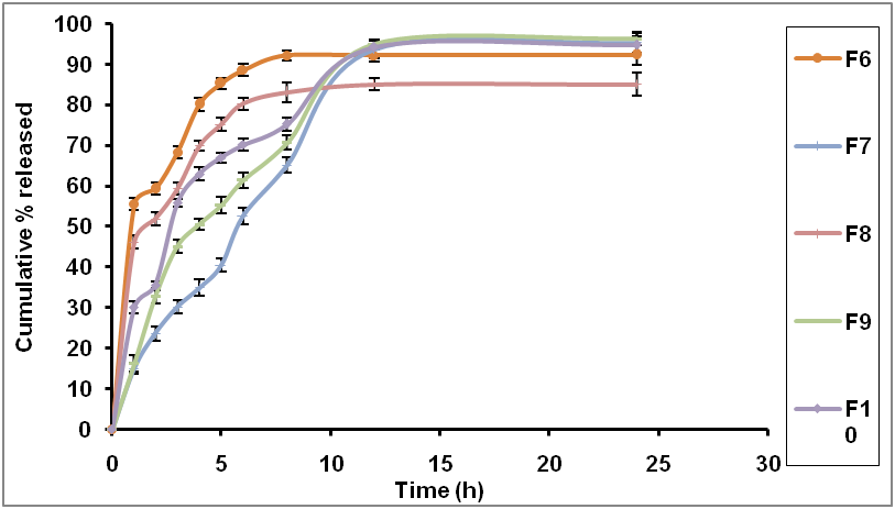 Fig. 4: In vitro release of itraconazole noisome (F6-F10), data’s are expressed as mean±SD (n=3)