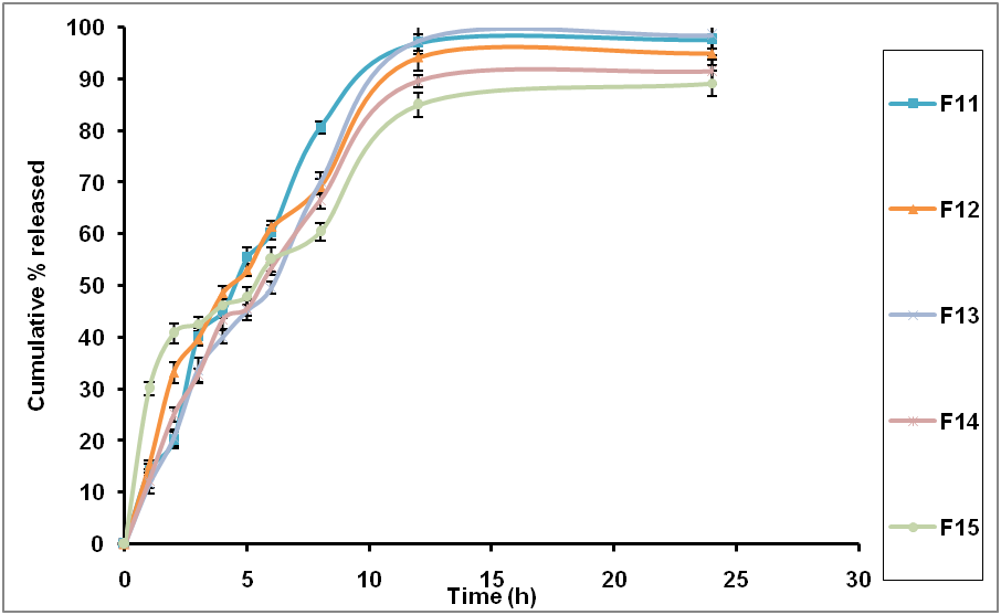 Fig. 5: In vitro release of itraconazole niosome (F11-F15), data’s are expressed as mean±SD (n=3)
