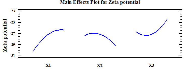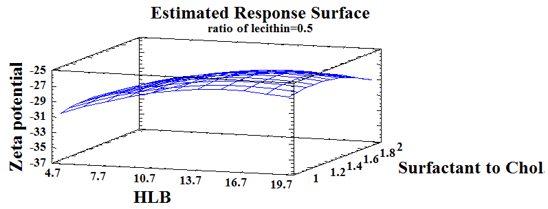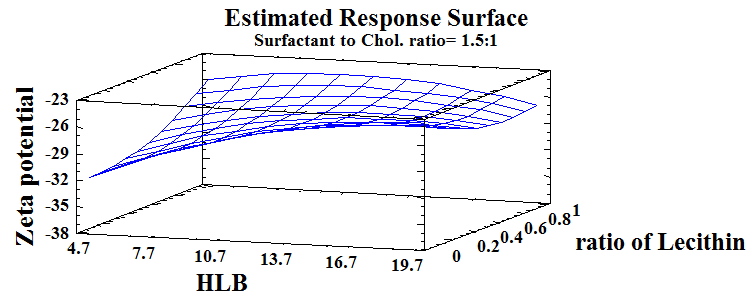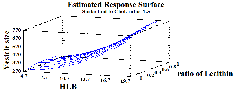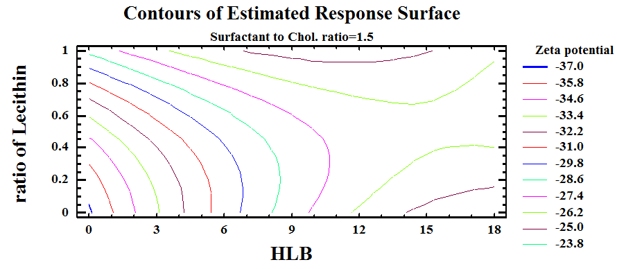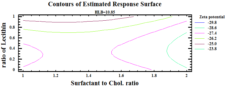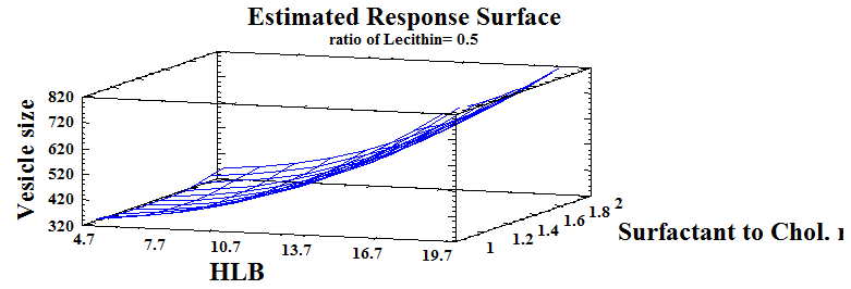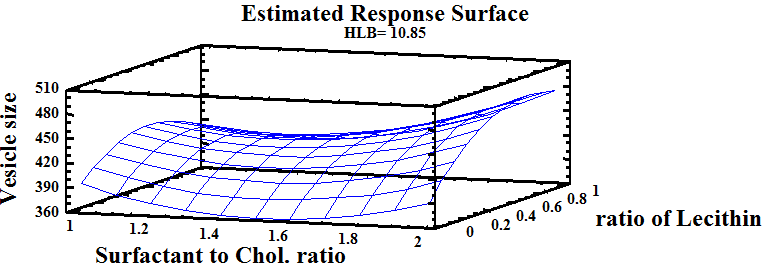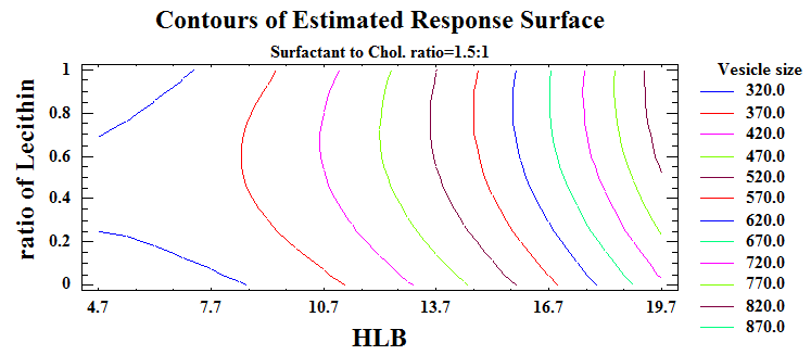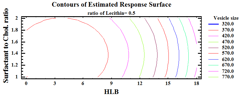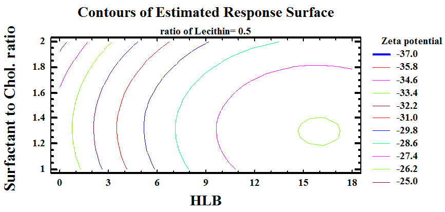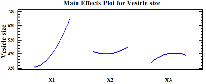 Variables X2, X3, (X1)2 and X1X2 have positive effects on in vitro release as revealed by the positive value of coefficients in the equation. While X1, X1X3, (X2)2, X2X3 and (X3)2 have negative effects on in vitro release as revealed by negative values of the coefficient in equation 2. Also, variables X1, X2, X3 and (X3)2 with positive effects on zeta potential assigned by positive value of coefficients in the equation, but (X1)2, X1X2, X1X3, (X2)2 and X2X3 have negative effects on zeta potential assigned by negative values of coefficient in equation 3. In addition to variables (X1)2, X1X3, (X2)2 and X2X3 have positive effects on vesicle size as revealed by the positive value of coefficients in the equation. While, X1, X2, X3, X1X2 and (X3)2 have negative effects on vesicle size as revealed by negative values of the coefficients in equation 4.