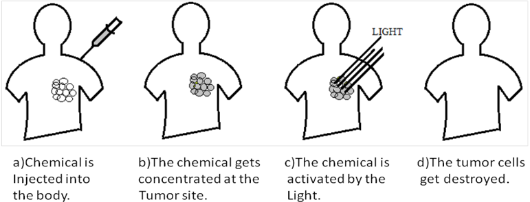 Photodynamic therapy is a type of treatment which uses photosensitisers for the destruction of cancerous cells. It is a minimal invasive mode of treatment. Photosensitisers have an ability to produce a biochemical reaction by absorbing the light [30]. The photosensitizers used initiates a cytotoxic activity towards malignant cancerous cells. The cytotoxic activity is due to the generation of ‘singlet oxygen’.