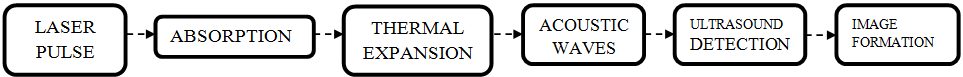 The photoacoustic imaging refers to the generation of acoustic waves, by absorbing the electromagnetic energy [33]. The radio frequency (rf) pulses or short pulses, which are non-ionising waves, are used to excite the megahertz ultrasound waves, referred to as photoacoustic or thermoacoustic signals, in biological tissues. Non-ionizing waves are used upon ionising waves because the former does not cause any health hazards. The general steps involved in the process of photoacoustic imaging is depicted below in fig. 6 [34].