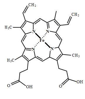 Heme part of hemoglobin is a porphyrin compound which carries an iron group as shown in fig. 7 [39]. The centre of porphyrin ring is occupied by the iron. This iron is linked to all the four nitrogen atoms of all pyrrole rings of porphyrin. It is also linked to the nitrogen of imidazole ring present in the globin part i. e to the histidine. Four polypeptide chains, two α and two β chains, constitute the globin part. α2 β2 forms the normal adult hemoglobin. Their main function in mammals is to transport O2, from lungs to tissues [40].