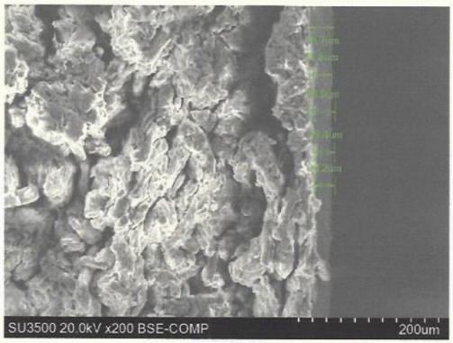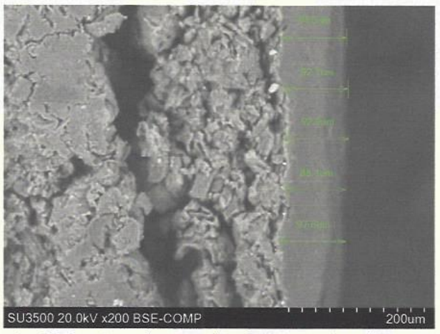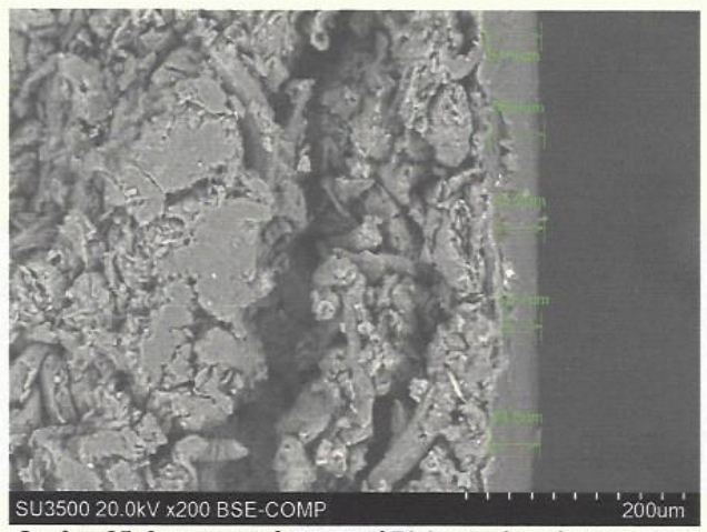 Fig. 1: Scanning electron microscope result for film coated surface with 3000x magnification (left) and thickness of coating layer with 200x magnification (right): FA (a,d), FB (b,e), and FC (c,f)