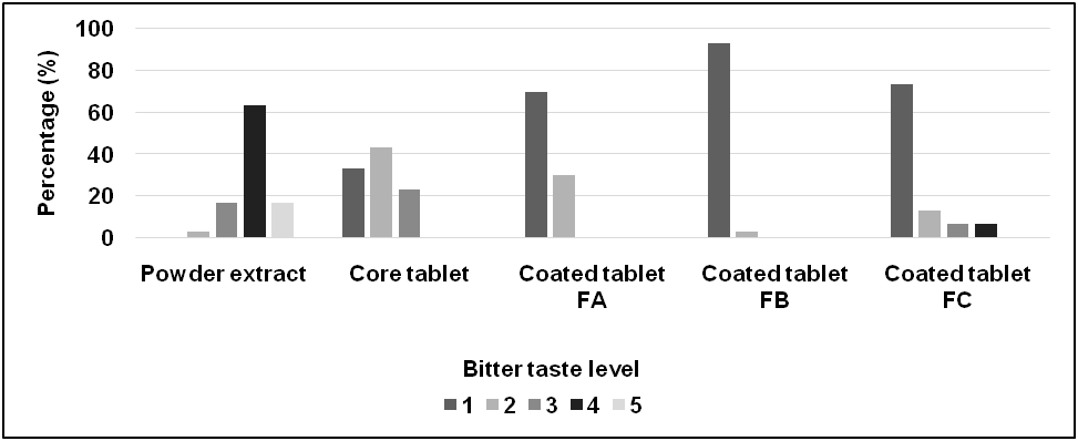 Bitter taste evaluation was performed on 30 respondents by giving the bitter taste level questionnaire of the three formulae of film-coated tablets, core, and extract powders. The questionnaire results were analyzed using statistical package for the social sciences (SPSS) program with Kruskal Wallis method. The bitterness level is from 1 (not bitter) until 5 (very bitter) [15, 16].