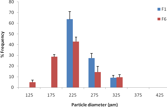Fig. 4: Particle size distribution of F1 and F6 batches, *each value is represented as a mean±SD, n=3