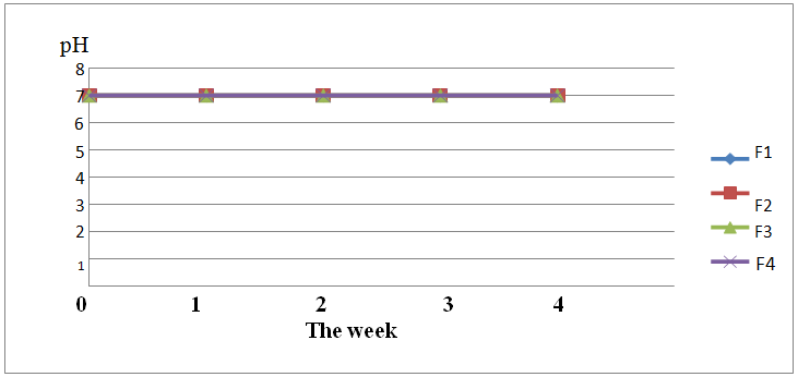 The pH test was performed from week 0 to week 4 on each of the oral, double emulsion of snakehead fish powder. The pH of all formulas until the 4th week, was stable at pH 7 (fig. 1). This double emulsion formula was made in w/o/w with the amount of water was more than the oil, so the pH of each formula followed the pH of the water (neutral). This pH is highly desirable because it corresponds to the stability of the active compounds that was stable at the neutral pH.