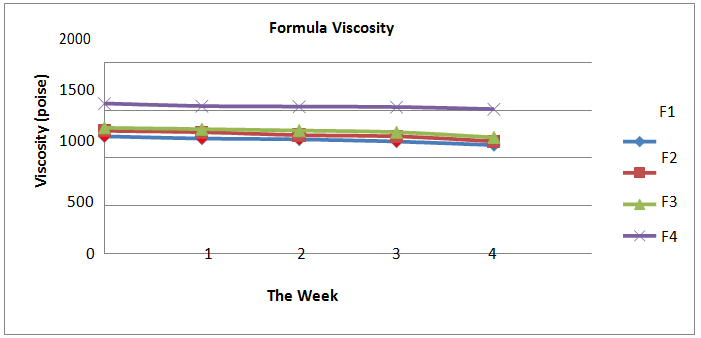 The viscosity test was performed from week 0 to week 4 using a spindle of Brookfield Viscometer number 3 at speed 30 RPM. The data showed that the highest viscosity was owned by formula 4 as shown in table 4 and fig. 2.