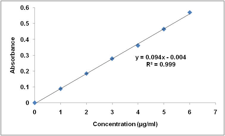 Linearity is the ability of a method to elicit test results that are directly proportional to the analyte concentration within a given range. The range is the interval between the upper and lower levels of analytes that have been demonstrated to be determined with precision, accuracy, and linearity using the method as described. 1, 2, 3, 4, 5 and 6 µg/ml of standard solutions were selected for assessing linearity range. The calibration curve was plotted using concentration of the standard solution versus absorbance and the regression equation was calculated. The least squares method was used to calculate the slope, intercept and correlation coefficient.