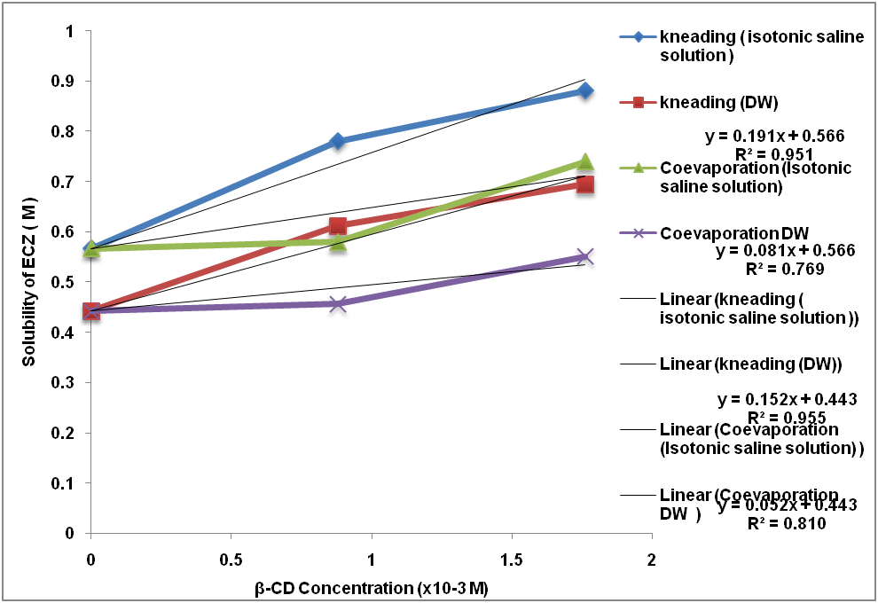 The solubility of ECZ alone and ECZ-β CD complexes using two methods (kneading and co-evaporation) in both isotonic saline solution and distilled water were studied as seen in fig. 1.