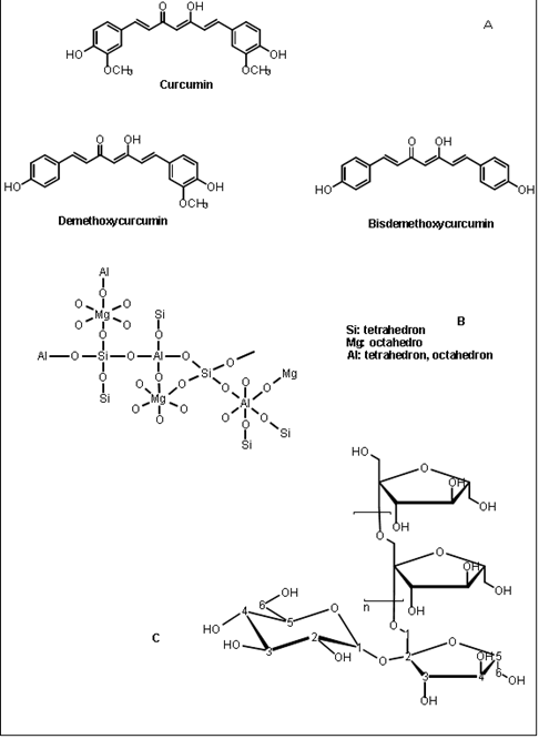 Fig. 1: A) Curcuminoids structure, (B) Neusilin US2 structure, (C) Inulin structure