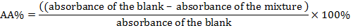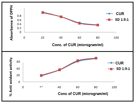 The antioxidant test was performed by DPPH free radical assay. The test was done for the prepared solid dispersion and raw CUR. This done to determine if CUR activity on scavenging free radicals was affected by the preparation method of solid dispersion. About 1.5 mg of DPPH (2,2-diphenyl-1-picrylhudrazyl) was dissolved in ethanol and analyzed using UV spectrometer at λmax 517 nm to obtain the absorbance of the blank. Then 0.5 ml of the blank solution was added to 1.5 ml of ethanolic solution of CUR at different concentrations (20-100 µg/ml) (n=3), incubated in the dark for 15 min and then analyzed at λmax 517 nm to obtain the absorbance of the mixture. The antioxidant activity was expressed as AA% based on the following equation: