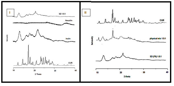 Fig. 2: I-shows the XRD pattern for the prepared solid dispersion (SD 1:5:1), Neusilin, Inulin and pure CUR. II-shows the XRD of pure CUR, physical mixture and solid dispersion (SD 1:5:1)