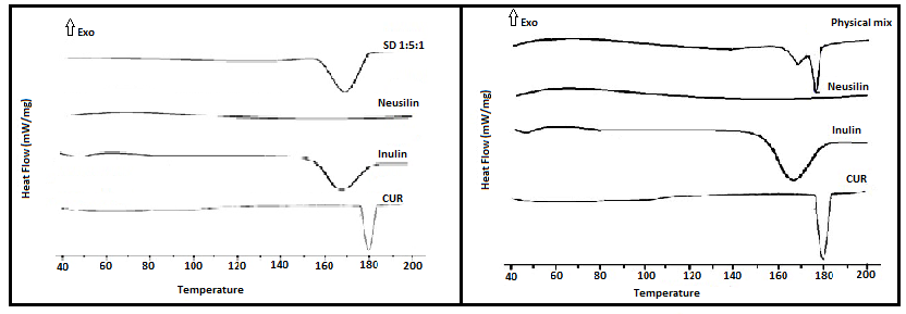 The DSC thermograms of raw materials are shown in fig. 3. CUR shows a sharp endothermic peak at 180 °C. These findings are in agreement with previously reported study[33]. This sharp melting peak indicates that pure CUR exists in the crystalline state. Inulin showed an endothermic peak at 169.5 °C. This peak is related to the melting of the substance. Meanwhile, Neusilin did not have any endothermic peak due to it amorphous nature.