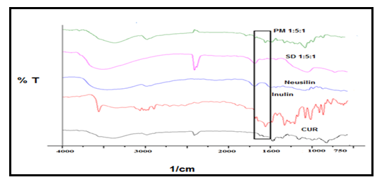 FTIR analysis was performed to provide structural information about the used materials and to detect the presence of any possible interactions between the drug and the carriers. These interactions are detected by any changes in the position or disappearance of a characteristic vibration or stretching region of the compound. FTIR spectra of CUR is shown in fig. 4. CUR shows a characteristic peak at 3450 cm-1 due to OH group stretching and a peak at 1650 cm-1 due to carbonyl functional group (C=O). Any interaction between CUR and the carriers is revealed by changing in the carbonyl peak position. FTIR of raw materials and solid dispersion (SD 1:5:1) are presented in fig. 4. The FTIR analysis of the physical mix and the solid dispersion shows that the C=O stretching of CUR was slightly shifted to a lower wavelength and the OH stretching peak disappeared. This change is attributed to the dilution effect of the carriers and hydrogen bonding between CUR and both carriers. Meanwhile, the physical mixture shows no change compared to the pure CUR other than dilution by the carriers.