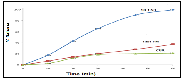 Fig. 5: Dissolution profiles of CUR, physical mixture and solid dispersion (SD1:5:1) (mean±SD, n=3)